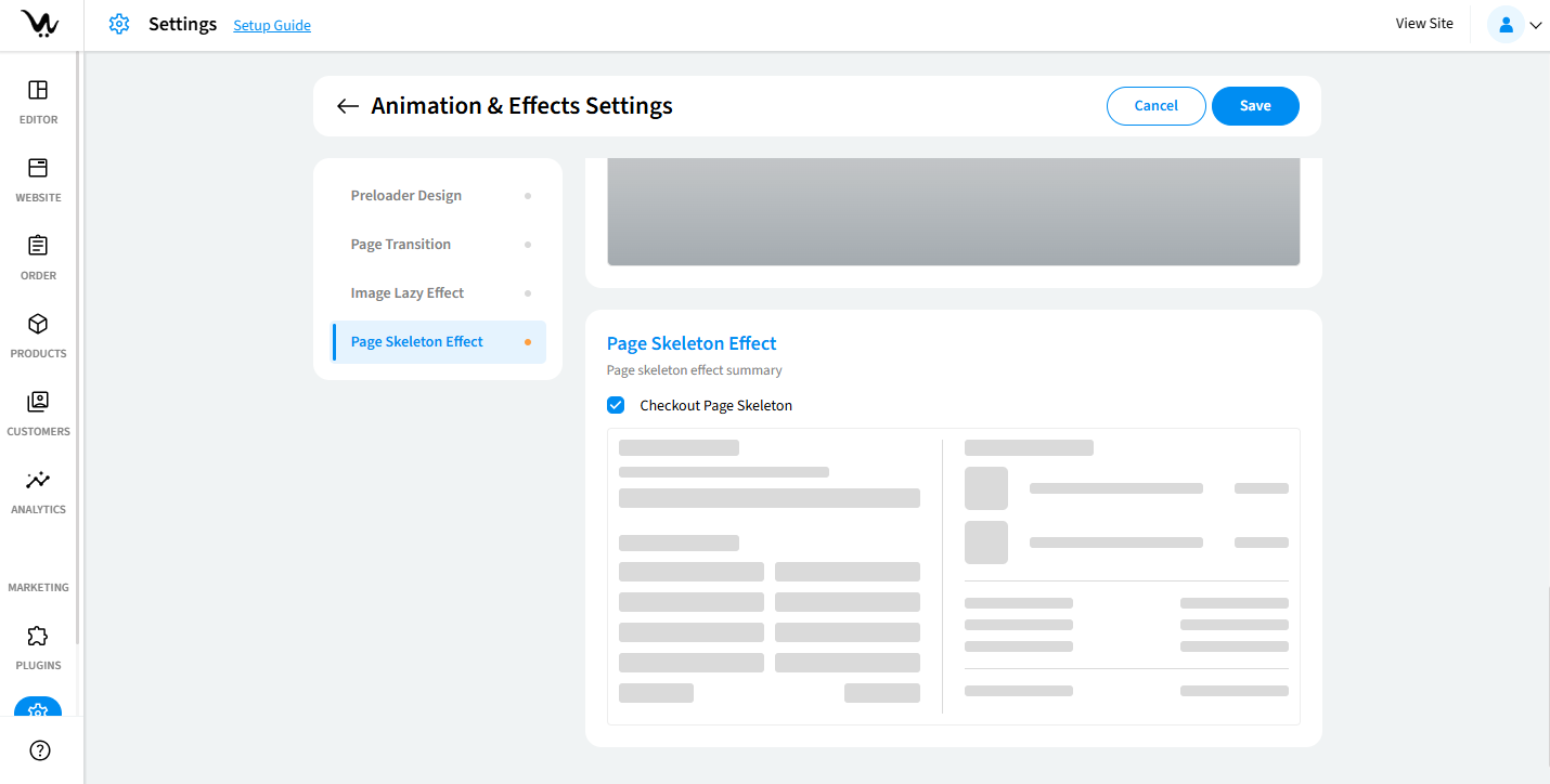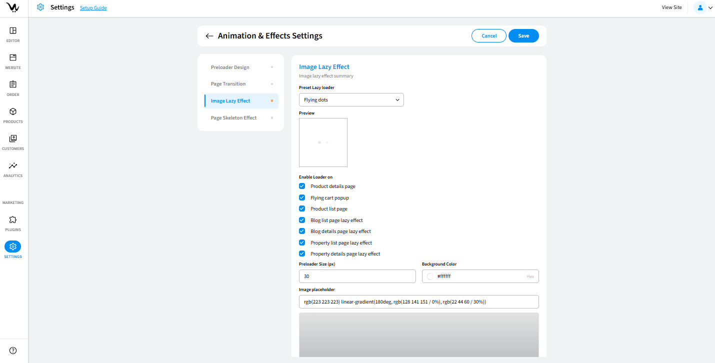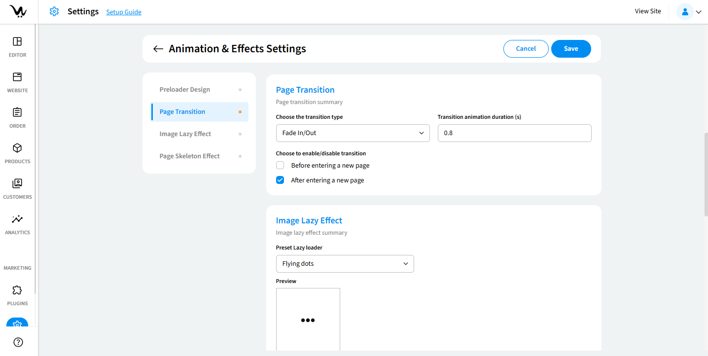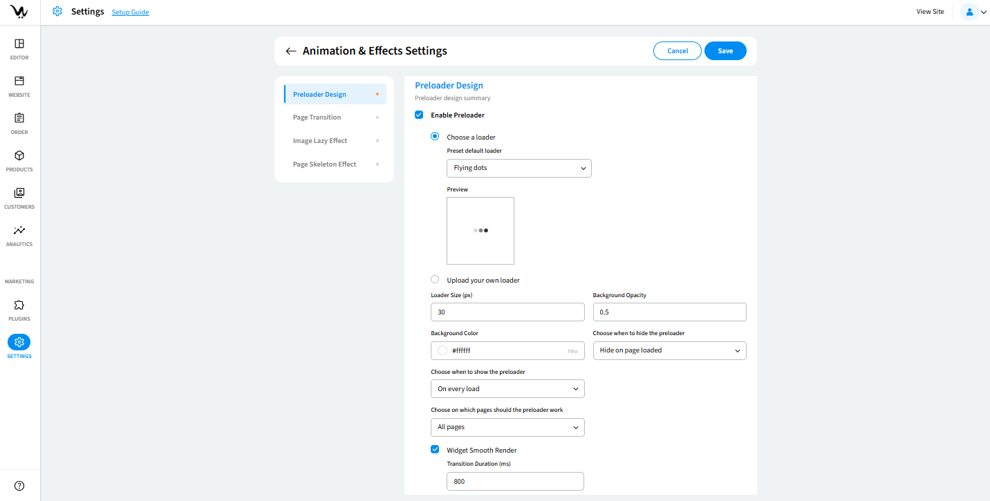 The Animation & Effects Settings enables you to enhance site interactivity and aesthetics through customisable preloaders, transition effects, lazy loading, and page skeletons. This improves perceived performance, visual appeal, and user experience.