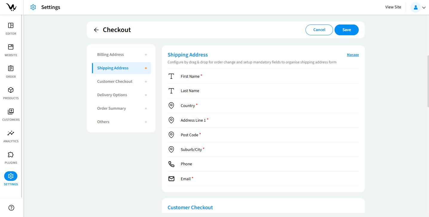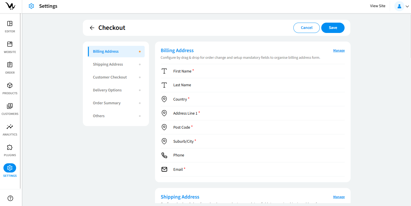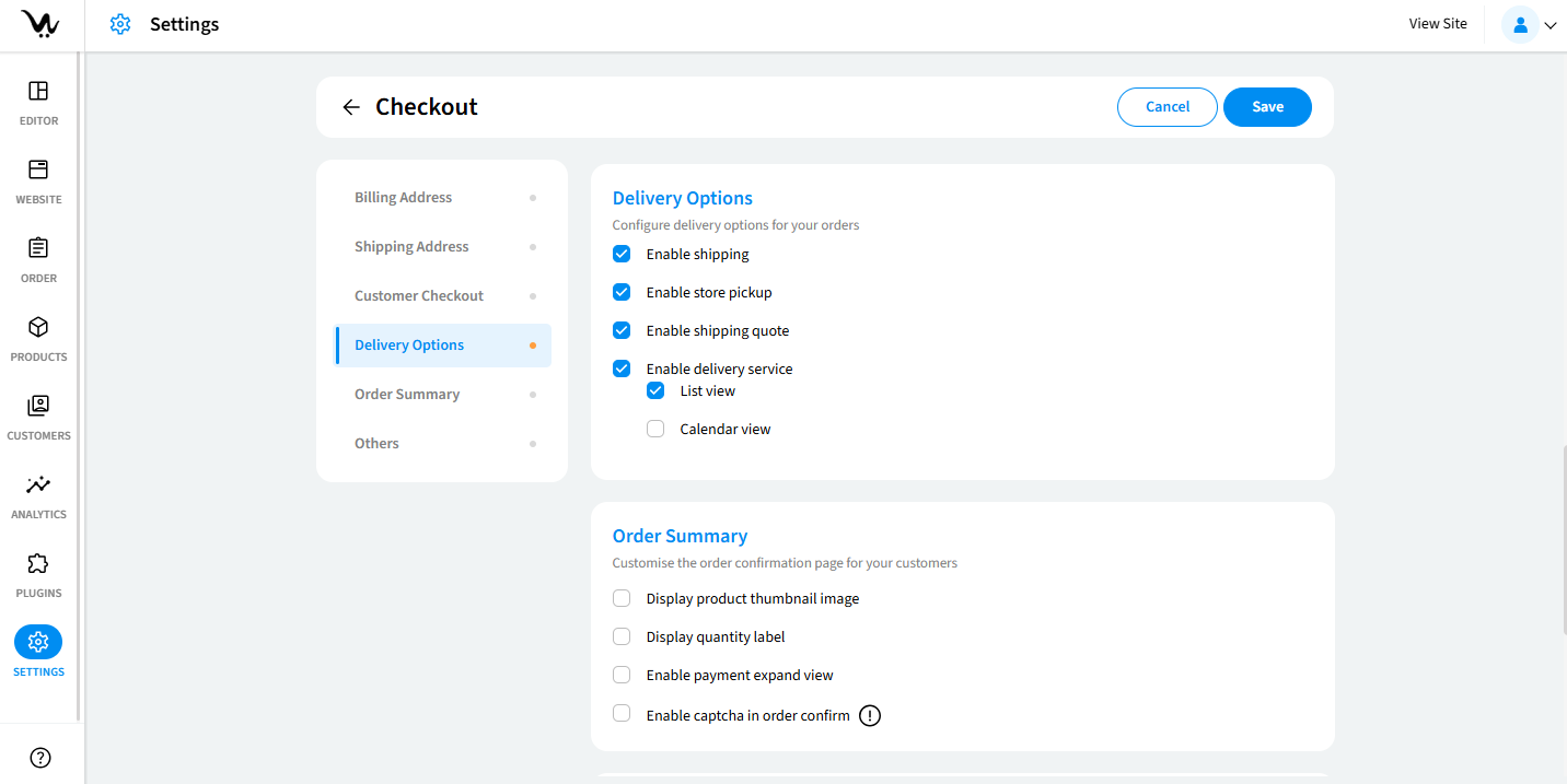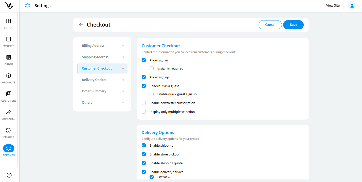 The Checkout settings allows you to configure the checkout process, ensuring a seamless and efficient experience for customers. You can enable or disable specific input fields and design the checkout page layout. Advanced features like guest checkout and delivery service configuration are also available.