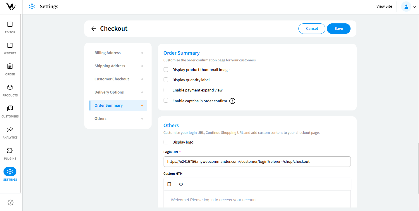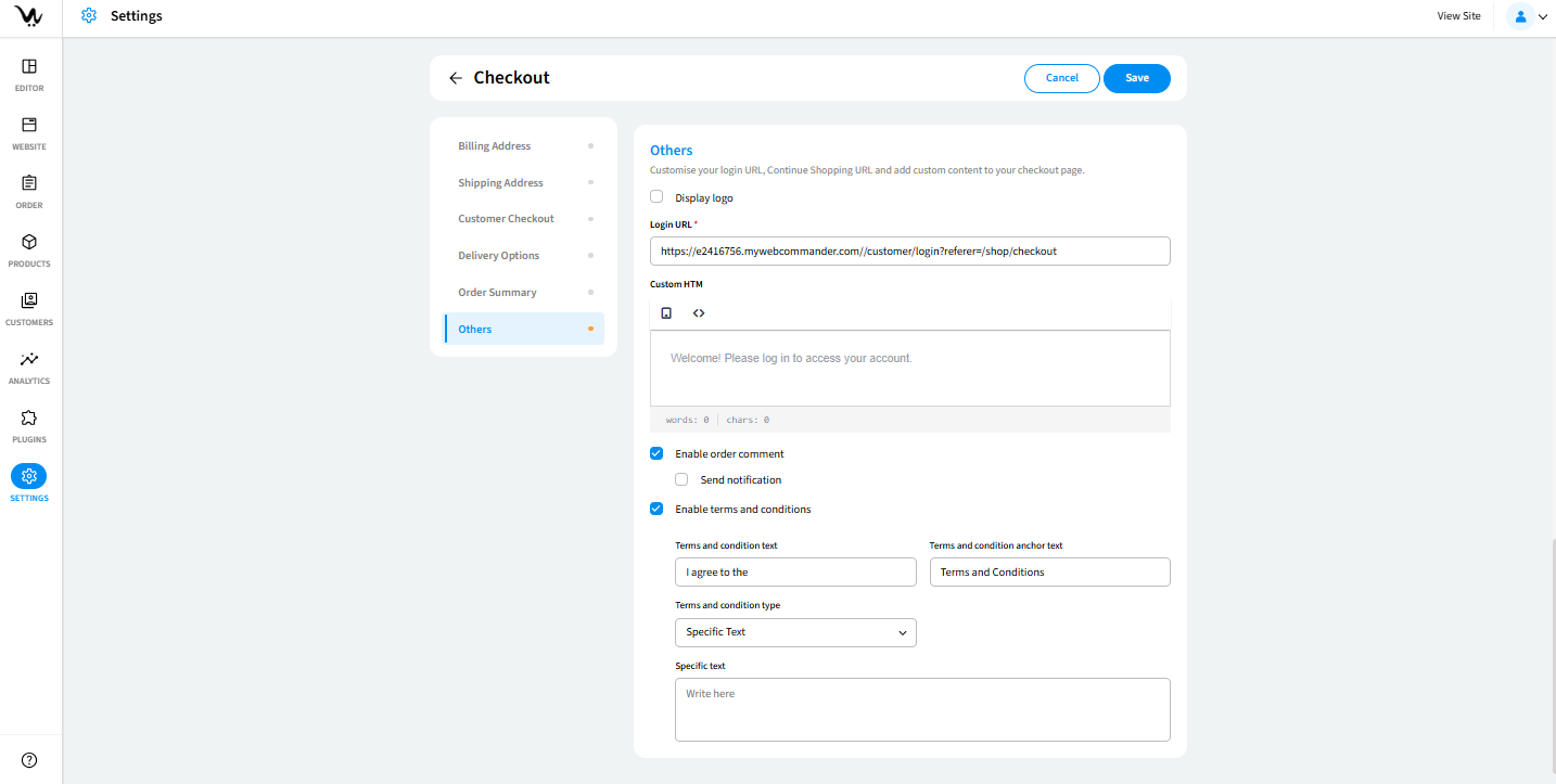 - Login URL: Allows input of a custom login page URL where the customers will be redirected to in order to checkout.