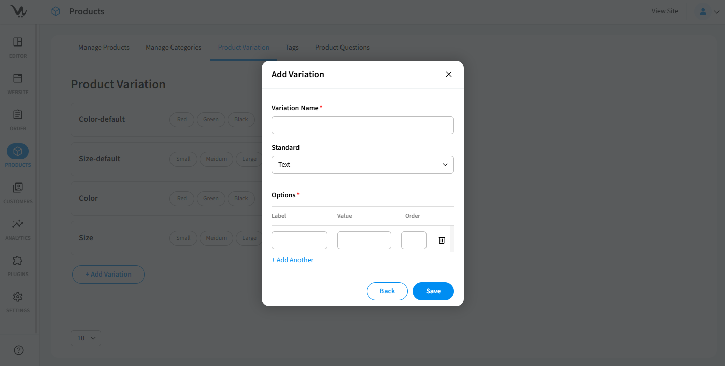 - Variation Name: Enter the name for the variation (e.g., Color, Size).
