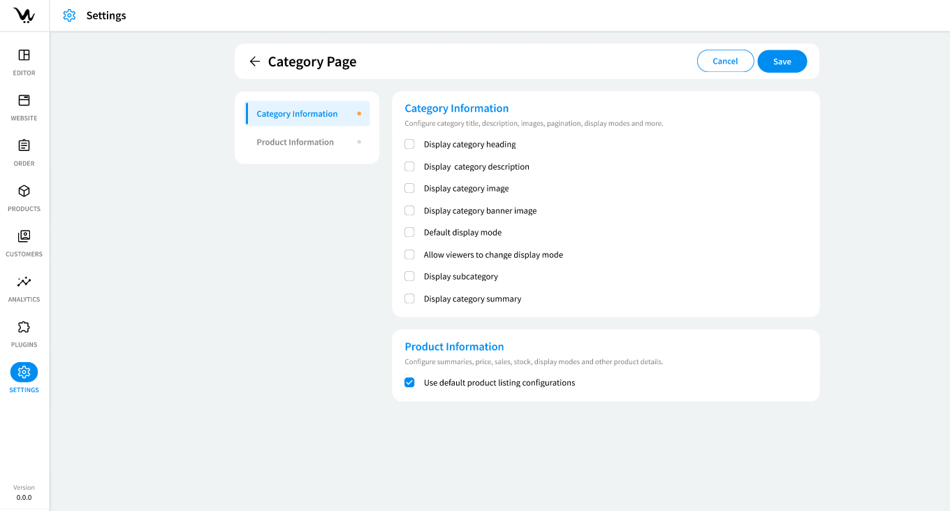 This guide will walk you through the "Category Page" settings of your store, explaining how to configure global category-related options. This section allows you to control how products are displayed, managed, and sold in each category on your website.