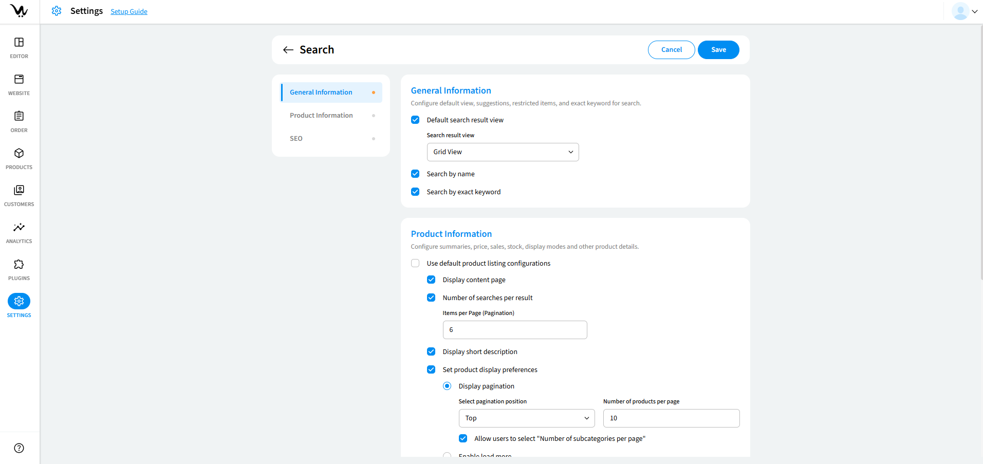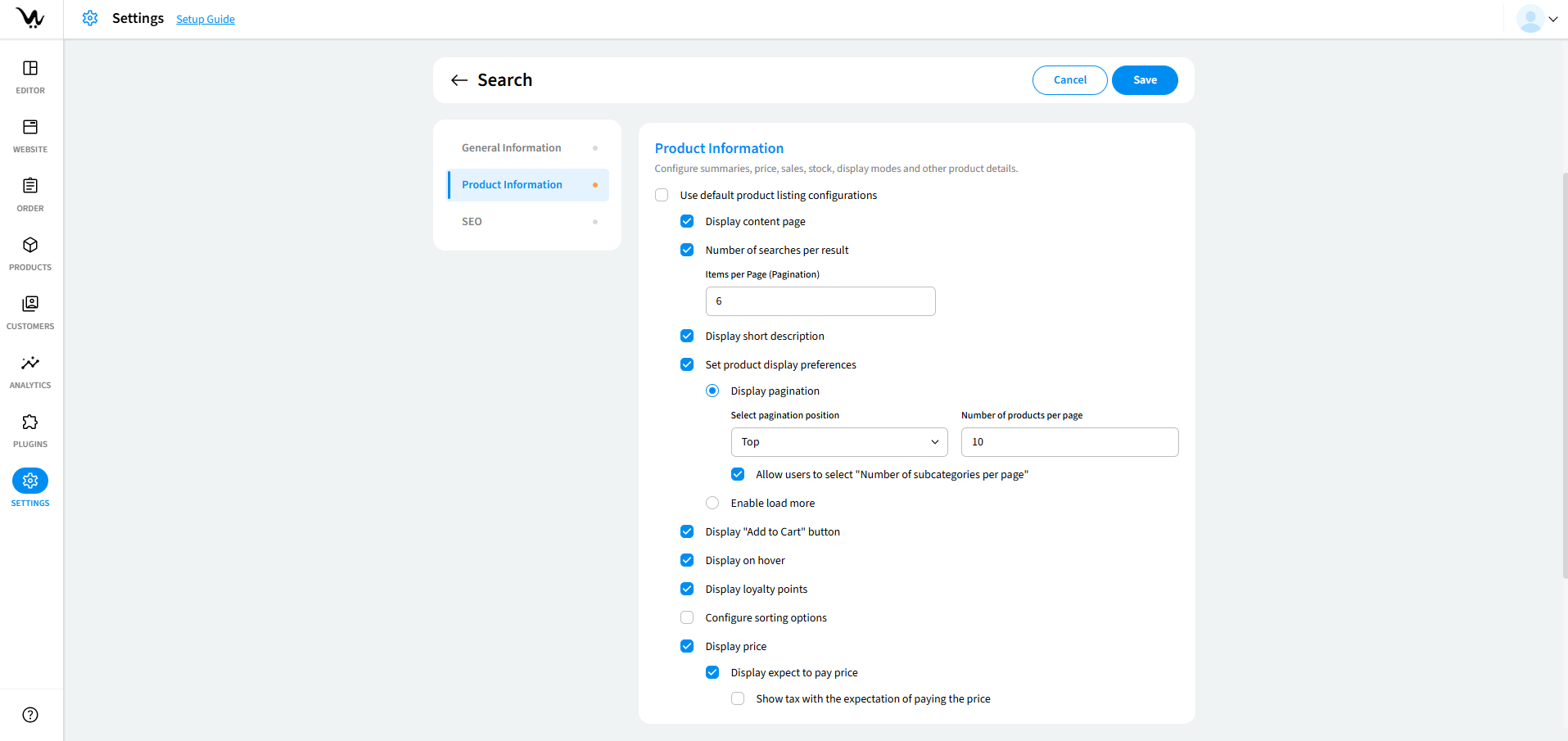 The Search Page Settings allow you to configure how search results appear to users, including layout preferences, search filters, pagination, and SEO settings.