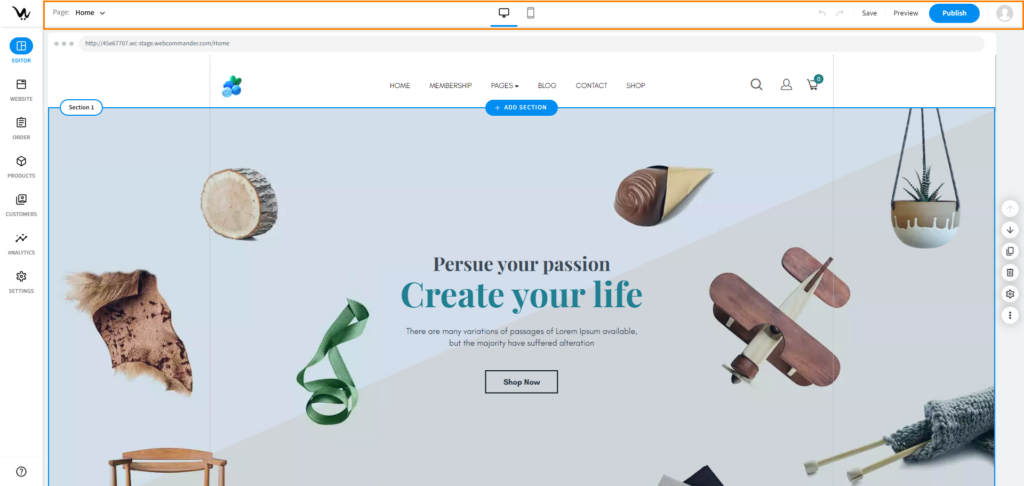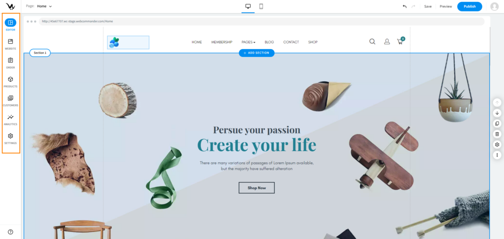 - Website: Manage your site’s pages, themes, and blogs from this section. Configure the navigation menu to improve site navigation.